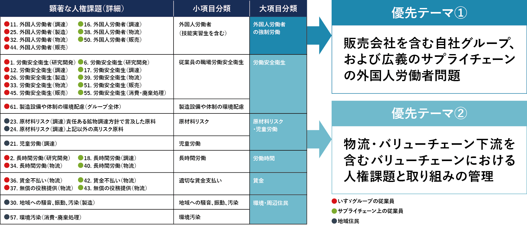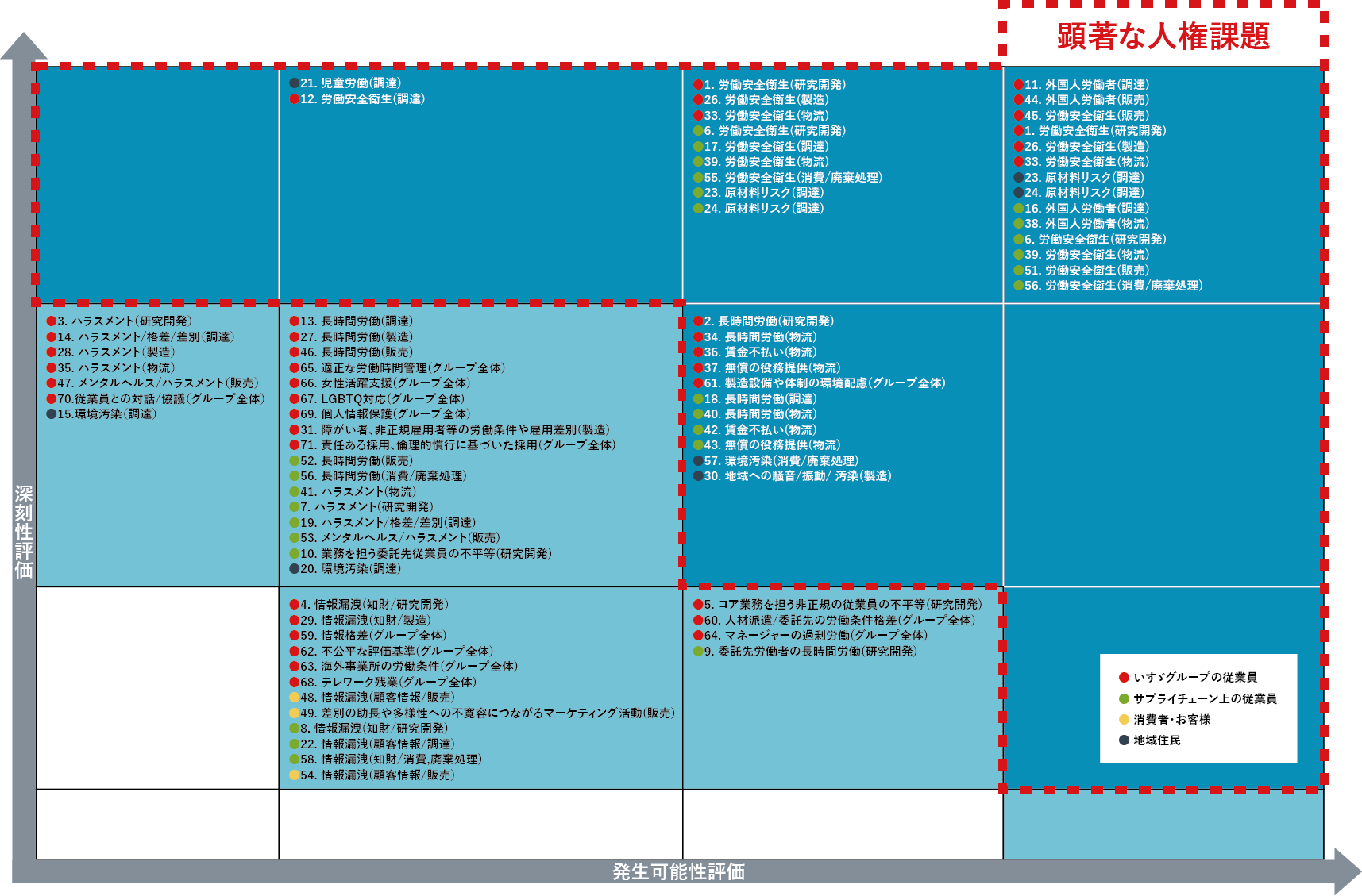 2024年2月、いすゞはグループレベルで、自社グループ内およびサプライチェーン上の人権リスクを洗い出し、定量的に評価して顕著な人権課題を特定しました。