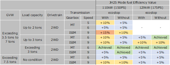 Improved fuel economy performance is achieved through enhancement of the aerodynamic performance of the cabin and increased application of fuel-saving tires. All vehicles achieved the 2025 Fuel Efficiency Standard, in particular the 2-ton ISIM-geared vehicle (with ecostop*2) exceeded the target by 15%, contributing to reduction of CO2 emissions.