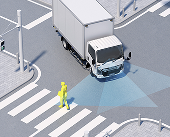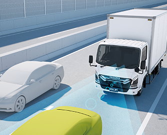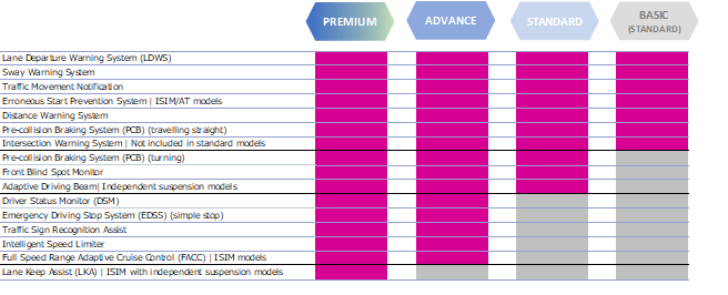 There are four safety assist feature packages on offer to meet the different needs and operational conditions of customers: BASIC, which primarily has the essential mandated features; STANDARD, which is equipped with effective features for urban transport; ADVANCE, which is equipped with effective and convenient features for driving on limited highways; and PREMIUM, which has steering control features.