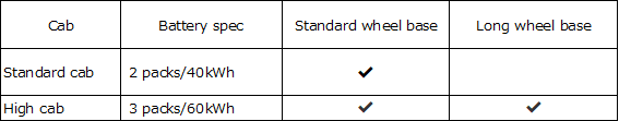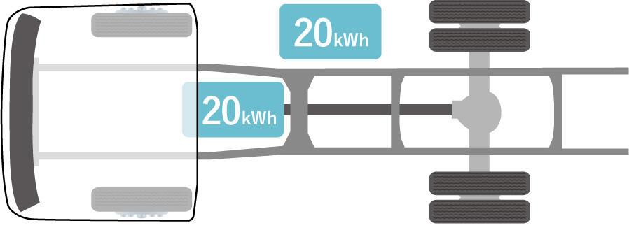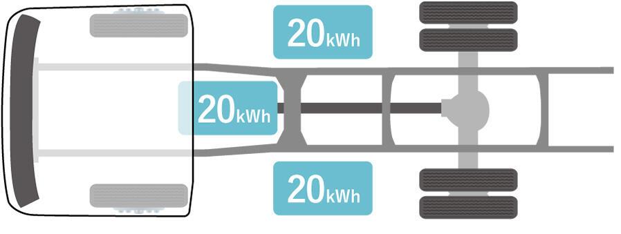 1)ISUZU has developed a compact battery pack (20kWh per pack) and applied a modular method to allow anywhere between 2 (40 kWh) and 3 (60kWh) packs of high-voltage batteries to be installed depending on vehicle size and usage.