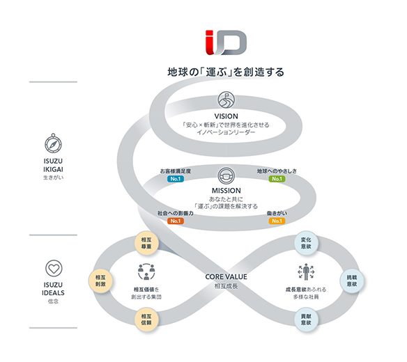 そのためには、いすゞグループ従業員一人ひとりが高い視座に立ち、同じ価値観を共有しながら、一丸となって社会課題の解決に取り組むことが必要と考え、2023年5月に、その指針となる新たな経営理念体系「ISUZU ID」を策定しました。