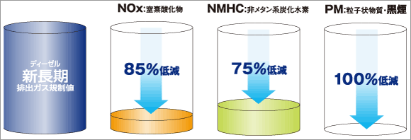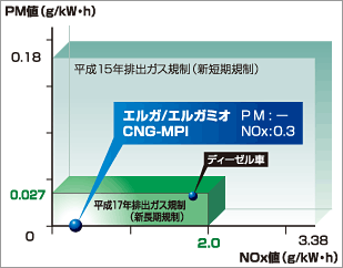 - 「新CNG車排出ガス技術指針(新長期規制)」に適合するとともに、国土交通省「低排出ガス車認定(認定低減性能向上改造自動車) 平成17年基準NOx10%低減レベル」を達成しています。