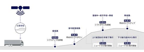 自動式変速トランスミッション「スム―サーGx」搭載車(※2)について、地図情報を活用したオートクルーズ機能を新たに追加しました。地図情報とGPSにより先行道路の勾配を予測し、適切なギヤ段を自動選択。燃料を節約し、より高いレベルの省燃費クルーズを可能にします。