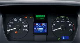 ユニバーサルデザインを採用したコンビネーションメーターでは、速度計やエンジン回転計の大径化を図り、メーター内の文字を拡大することで視認性が向上しました。また、マルチモニターと液晶ディスプレイでドライバーや管理者に各種車両情報・整備情報を的確に伝達します。