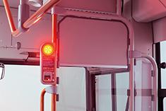 走行中、ドライバーが急病などで安全に運転できない状態に陥った場合、乗客や乗務員が非常ブレーキスイッチを押すことで、減速して停止させます※1。スイッチが押されると車内では音声アナウンスと赤色フラッシャーランプにより、異常時であることを乗客に伝達します。さらに、車外にはホーンを鳴らし、ハザードランプとブレーキランプを点滅させて異常事態を知らせます。路線バスの運行上必要となる立席の乗客の安全性に配慮し、観光バス用EDSSとは異なるブレーキ制御となっています。