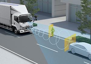 広角の近距離ミリ波レーダーをキャブ前面2カ所に設置し、交差点や丁字路走行時の自動車やバイク、自転車、歩行者等を検知し衝突の危険性が高まると、ピラーに内蔵された警告灯と警報音でドライバーに注意を促し、右左折時や出会い頭時の事故抑制に貢献します。