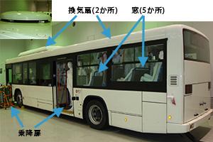 - 路線バスには、天井の前後に換気扇が備えられています。また、窓は、左側は中扉より後ろに2か所、右側はドライバー席、ドライバー席の後ろ、最後席の2か所、計5か所に設置してあります。(図1)