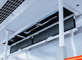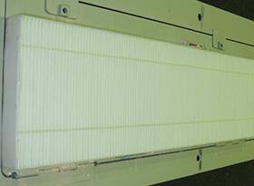 エアコンの車内空気取り入れ口(図2)には、防じんフィルターが装着されていますが、そこにエアロゾルフィルター(図3)を使用した場合の効果を確認するため、乗降扉および窓は閉めた状態で、エアコンのブロアを強にして換気のシミュレーションを行いました(動画5)。排出された飛沫核は、エアコンのブロアの気流により上昇し、エアコンの空気取り入れ口に吸い込まれまれ、エアロゾルフィルターにより飛沫核が捕集されます。