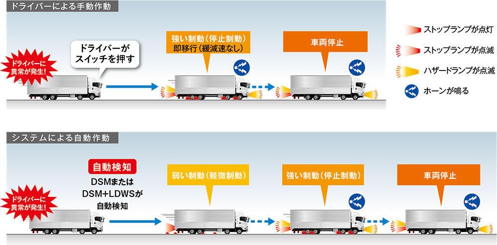 - ・ディーゼル車に展開しているEDSSを、新たにLNG車とCNG車にも展開します。ドライバーの状態をモニタリングするドライバーステータスモニター(DSM)のカメラが異常を検知した場合※4、もしくはドライバー自身によるEDSSスイッチの操作があった場合にブレーキ制御を自動で開始、徐々に速度を落として停止します。