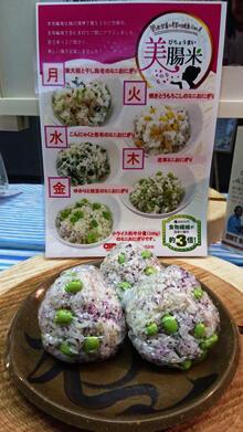 また、腸内環境を整えるのに効果的な食物繊維を多く含む食材を加えた、“美腸米ミニおにぎり”も日替わりで提供しました。