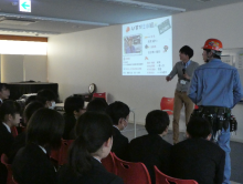 今回紹介した部署は、海外営業部、シャシ設計部、車両製造部(保全課)で、自分が担当する仕事の役割や職場の様子について、工夫を凝らした資料を使って分かりやすく説明すると、生徒全員が真剣なまなざしで興味を示してくれました。