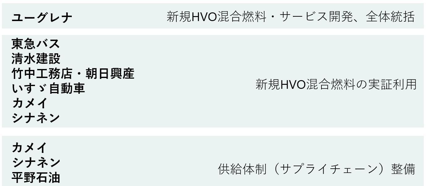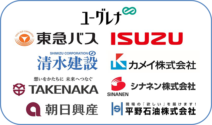 株式会社ユーグレナ(本社:東京都港区、代表取締役社長:出雲充、以下「ユーグレナ」)と、東急バス株式会社(本社:東京都目黒区、代表取締役社長:古川卓、以下「東急バス」)、清水建設株式会社(本社:東京都中央区、取締役社長:井上和幸、以下「清水建設」)、株式会社竹中工務店(本社:大阪府大阪市、取締役社長:佐々木正人、以下「竹中工務店」)、株式会社朝日興産(本社:大阪府大阪市、取締役社長:宮本靖雄、以下「朝日興産」)、いすゞ自動車株式会社(本社:神奈川県横浜市、代表取締役 取締役社長 COO:南真介、以下「いすゞ自動車」)、カメイ株式会社(本社:宮城県仙台市、代表取締役社長:亀井昭男、以下「カメイ」)、シナネン株式会社(本社:東京都品川区、代表取締役社長:小松良則、以下「シナネン」)、平野石油株式会社(本社:東京都台東区、代表取締役:平野賢一郎、以下「平野石油」)の9社は、東京都の令和6年度「新エネルギー推進に係る技術開発支援事業」に、「新規HVO※混合燃料の開発及びサプライチェーン構築とその社会実装」(以下、「本事業」)が採択されたことをお知らせします。