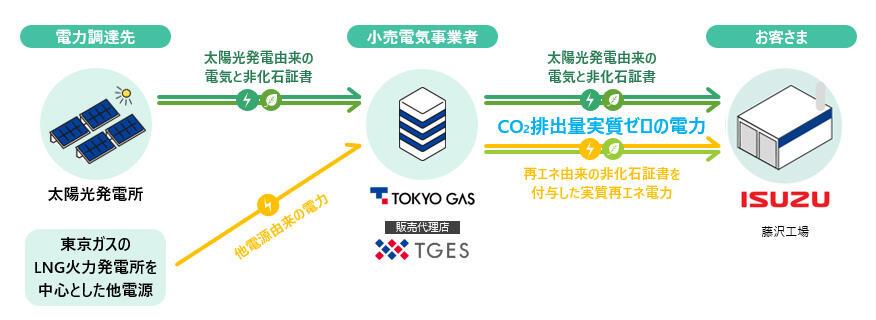 いすゞ自動車株式会社(本社:神奈川県横浜市、社長COO:南真介、以下「いすゞ」)、東京ガス株式会社(本社:東京都港区、社長CEO:笹山晋一、以下「東京ガス」)、東京ガスエンジニアリングソリューションズ株式会社(本社:東京都港区、社長:小西康弘、以下「TGES」)の3者は、いすゞの藤沢工場(神奈川県藤沢市)および栃木工場(栃木県栃木市)へオフサイトコーポレートPPA※1スキーム(以下「本スキーム」)を活用して実質再生可能エネルギー100%の電力(以下「再エネ100%電力」)を導入することに合意しました。