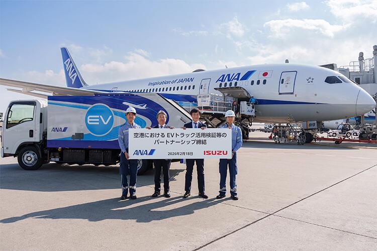 - ・ANAは、いすゞとEVトラック活用検証等のパートナーシップを締結し、BEV※1トラック「エルフEV」のカーゴトラック (手荷物運搬車※2) を、2月18日より導入します。