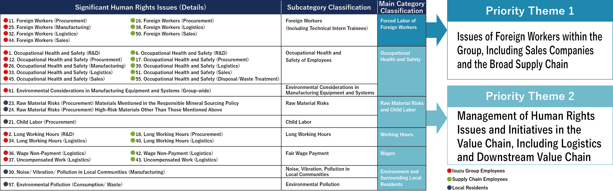 In February 2024, Isuzu reviewed and quantitatively assessed human rights risks within its Group and in its supply chain at the group level to identify notable human rights issues. From the notable issues identified, we selected priority themes to be addressed in the short- to medium-term, and developed prevention and mitigation measures focusing on these priority themes.