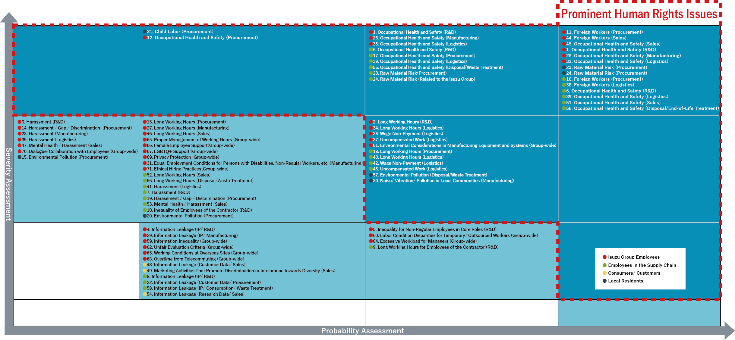 STEP 1: Organized human rights issues by quantifying their severity and likelihood, considering Isuzu's perspective as well as stakeholder concerns. This assessment was based on publicly available external materials.