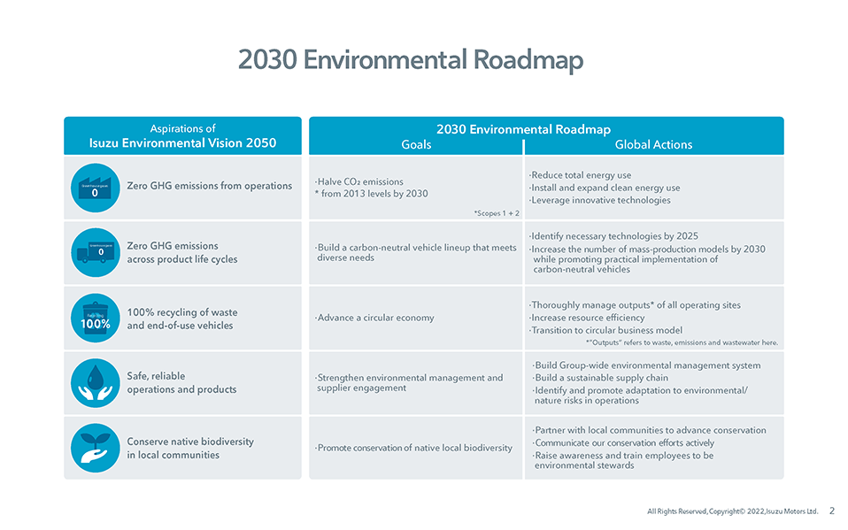 Isuzu has announced a roadmap for ensuring steady progress toward Isuzu Environmental Vision 2050. The 2030 Environmental Roadmap translates the vision into goals and global actions for pushing forward on decarbonization and environmental sustainability in the years leading up to 2030.