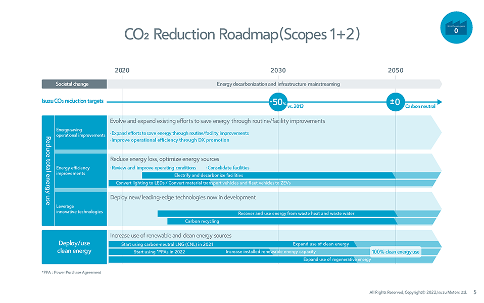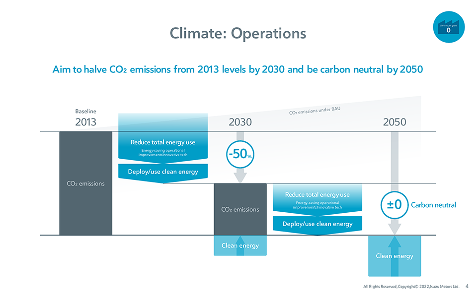 We will aim for zero greenhouse gas (GHG) emissions arising directly from Isuzu Group operations by 2050