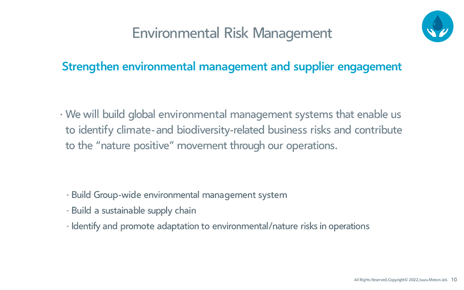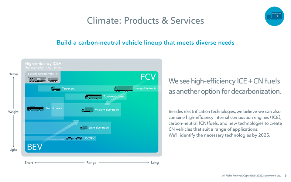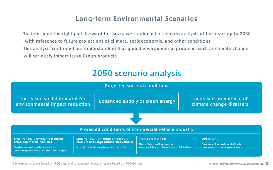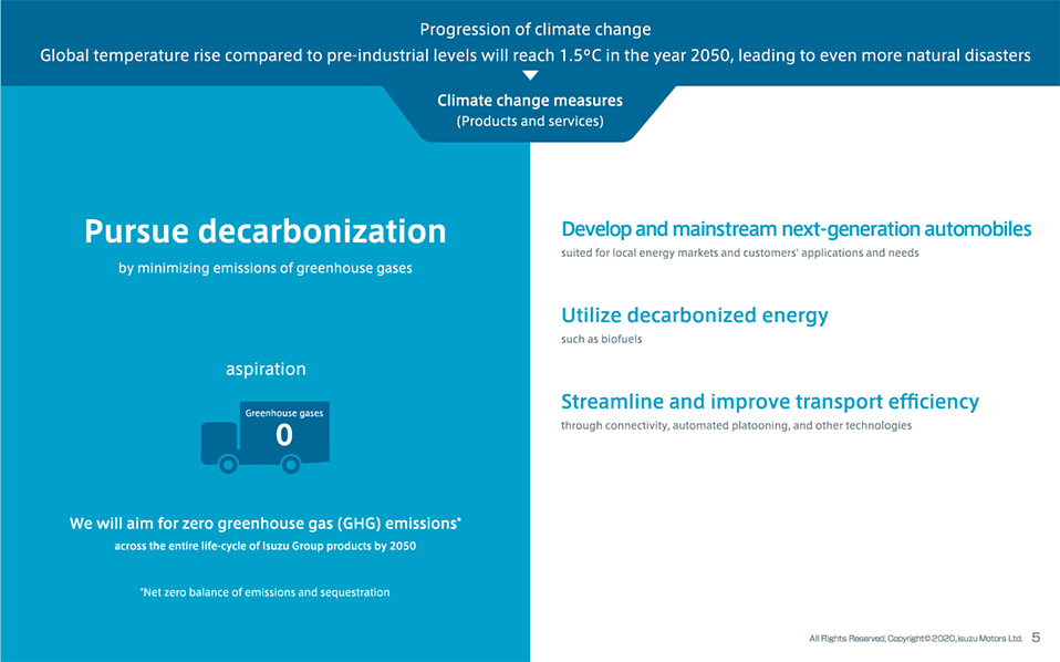 We will aim for zero greenhouse gas (GHG) emissions across the entire life-cycle of Isuzu Group products by 2050