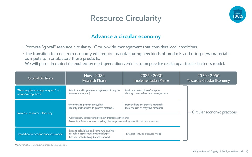 We will achieve 100% recycling of waste and end-of-use vehicles generated by Isuzu Group operations by 2050