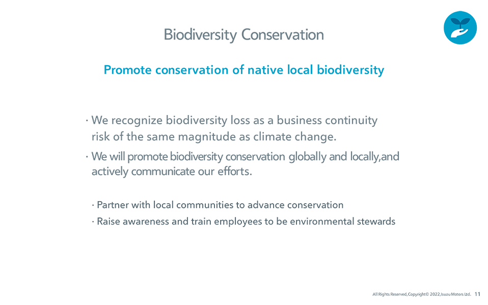 We will conserve native biodiversity in the areas surrounding Isuzu Group operations in partnership with NGOs and other stakeholders