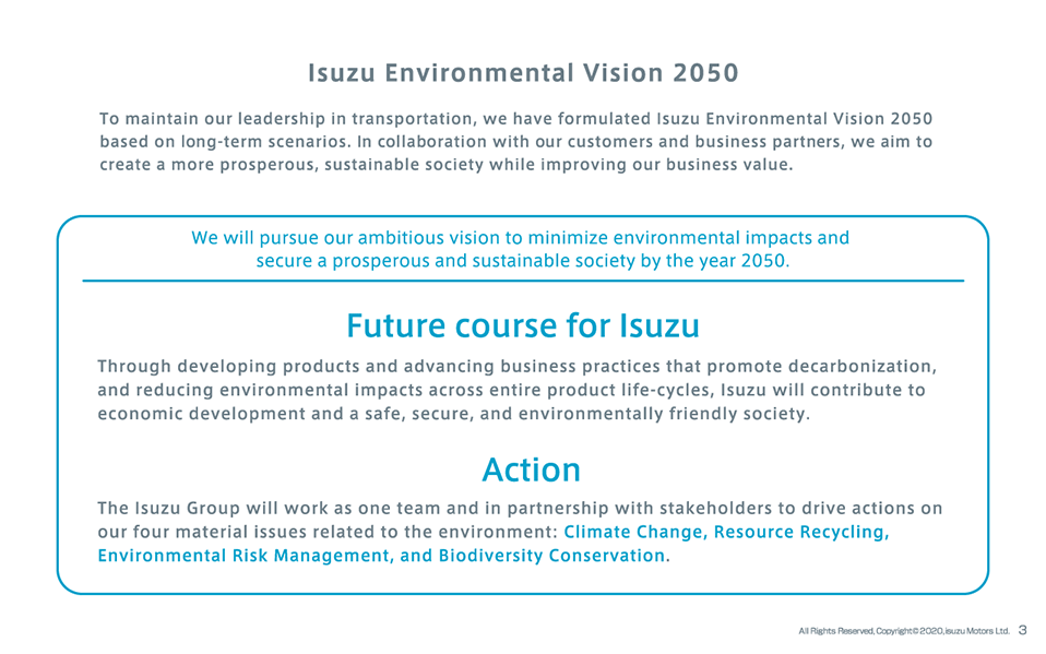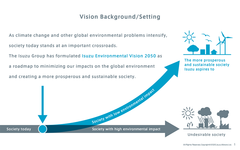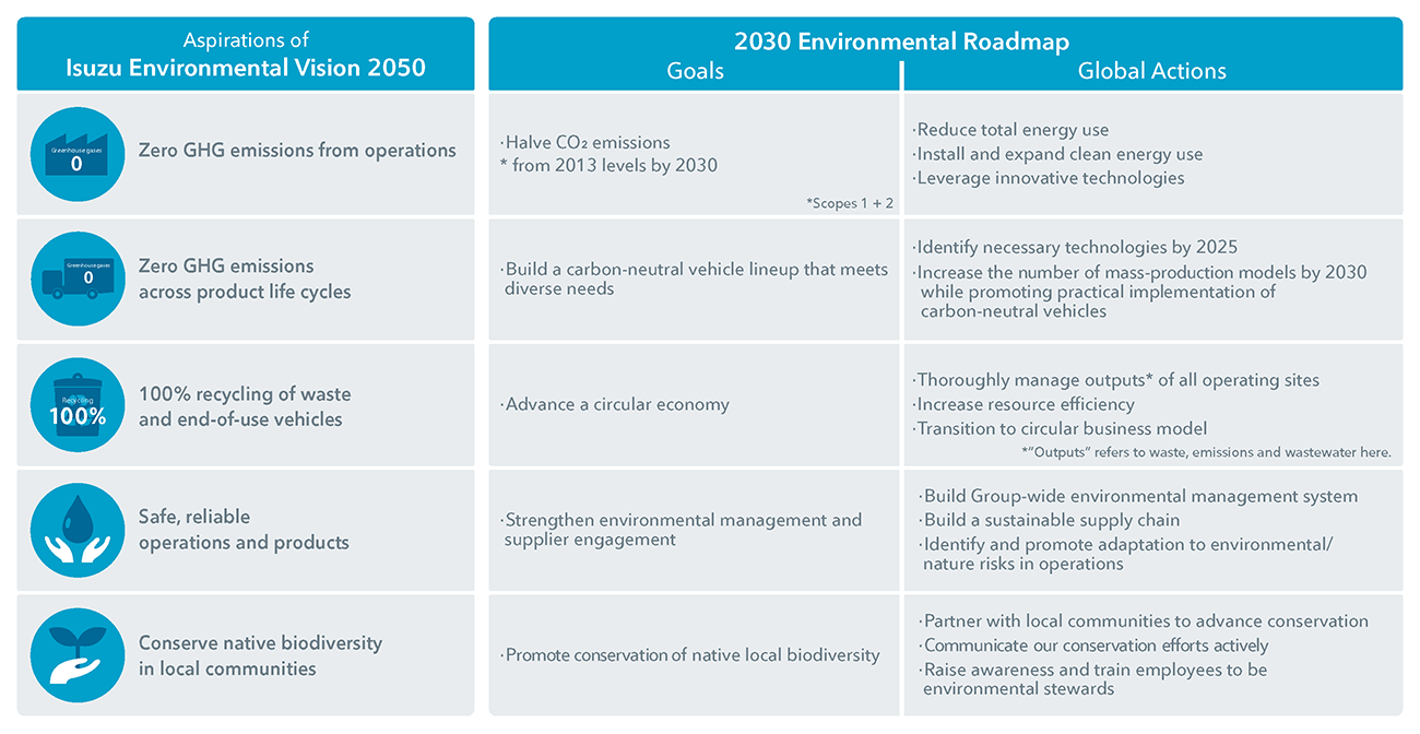 The Isuzu Group has formulated Isuzu Environmental Vision 2050 as a roadmap for maintaining our leadership in transportation and securing a prosperous and sustainable society by the year 2050.